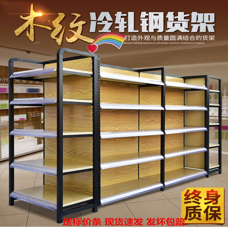 新疆乌鲁木齐四柱木纹超市货架便利店商品柜母婴店文具店饰品货架热门设计联盟服务商