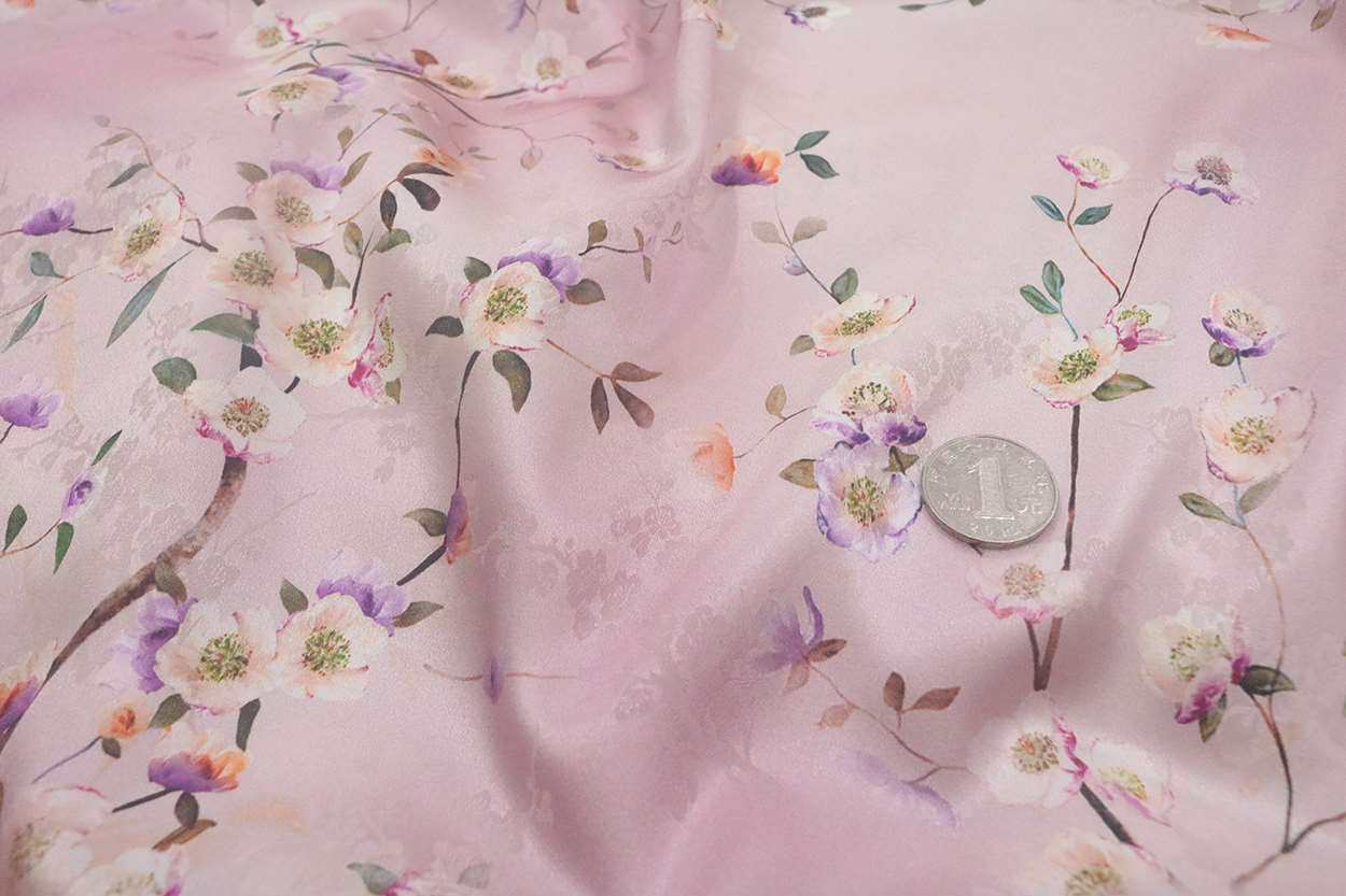 2021紫粉底梅花提花束小碎花数码喷绘面料姆米真丝绸缎布料旗新品热门设计联盟服务商