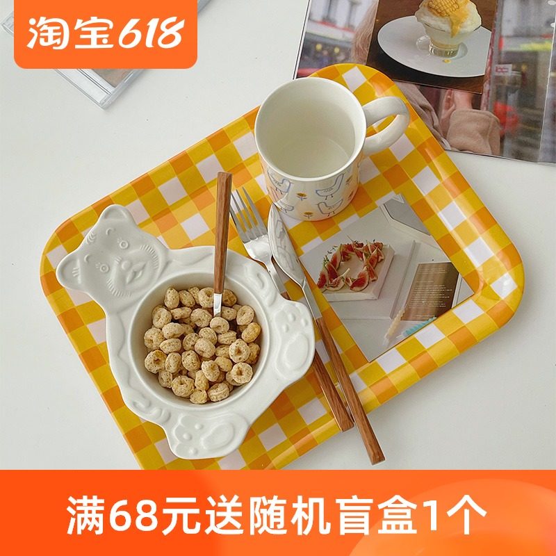 *穆尼生活*韩国ins风黄色格子托盘长方形早餐水果餐盘收纳装饰盘热门设计联盟服务商